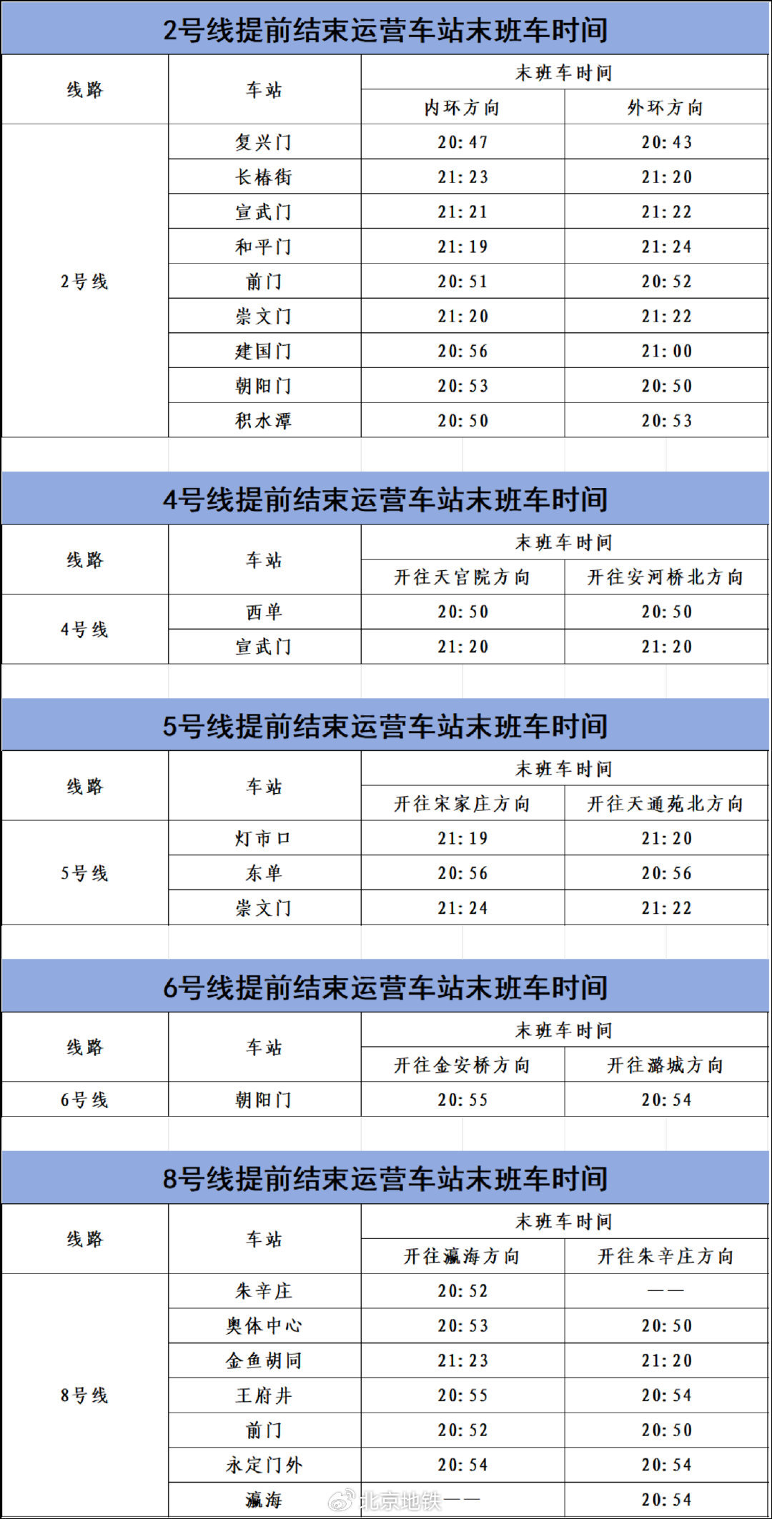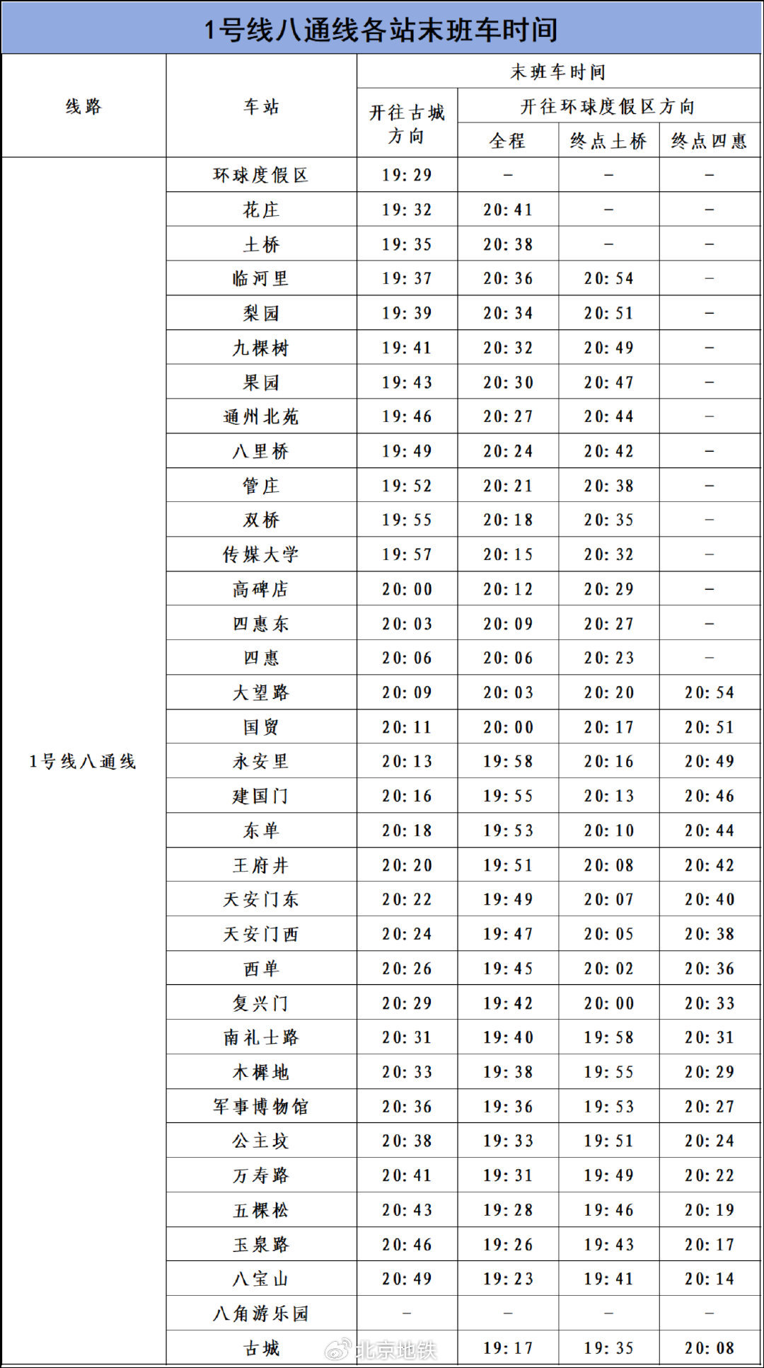 一、1号线八通线提前结束运营,古城始发的全程末班车时间为19:17、环球度假区始发的全程末班车时间为19:29;1号线八通线各站末班车驶离后,与1号线八通线换乘的部分车站封闭至各线路运营结束(2号线复兴门、建国门,4号线西单,5号线东单,8号线王府井,9号线军事博物馆、10号线国贸、公主坟,14号线大望路)。