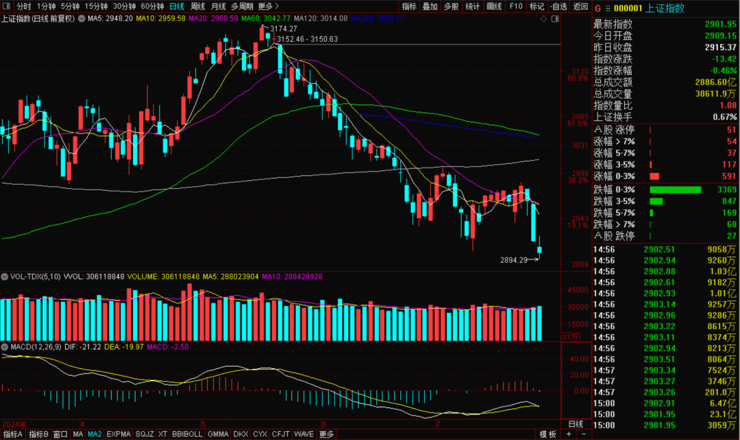 经过8天缩量横盘后,昨天大盘向下选择方向,而今天沪指在跌破2900点整数关口后奋力翻红。