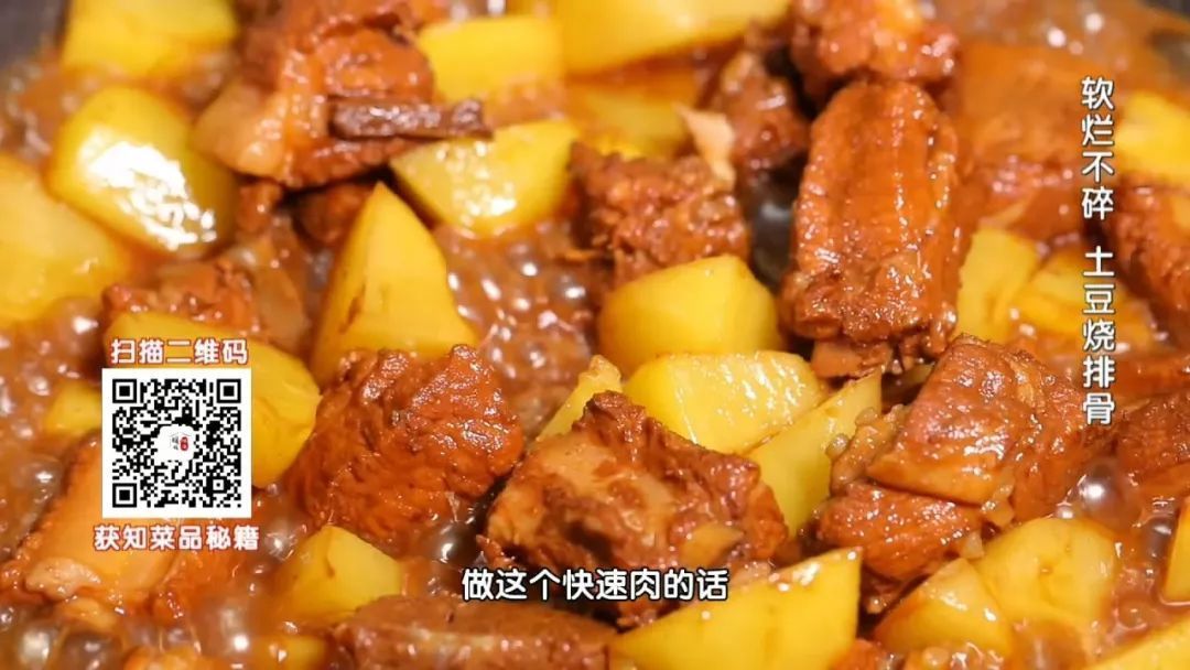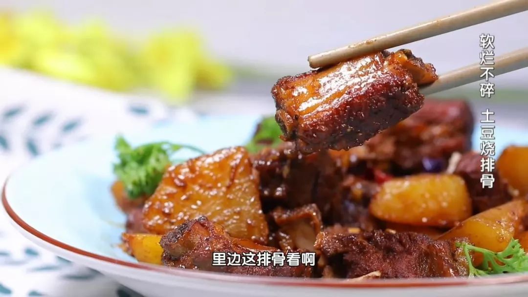 完成:倒出部分汤汁入另一锅放入土豆烧制三分钟,连肉带汤倒入排骨,烧至略收汁即可。
