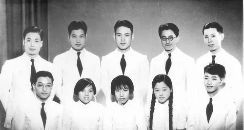 1936年夏,清华大学物理系毕业生合影[前排左起:王大珩、戴中扆(黄葳)、许孝慰、何泽慧、郁钟正(于光远);后排左起:钱三强、杨镇邦、陈亚伦、杨龙生、谢毓章]