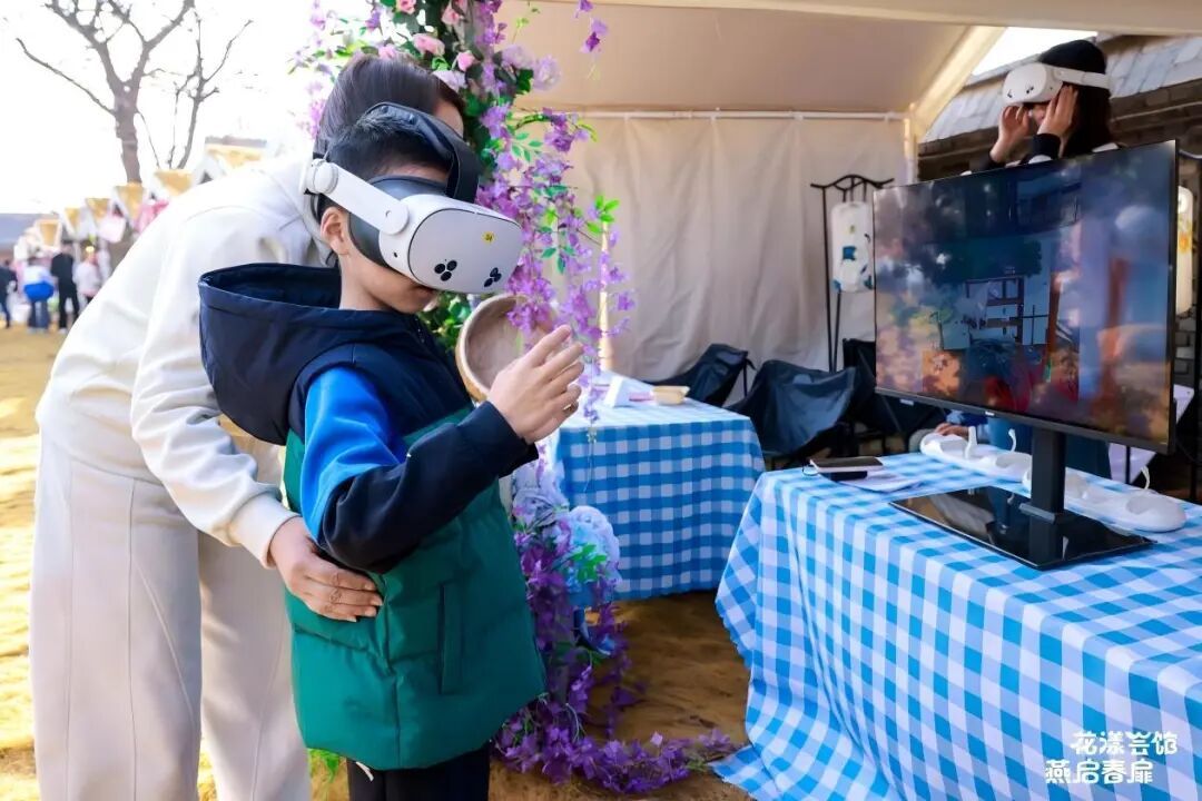 在MR混合现实体验区,游客戴上头显即可瞬间“进入”一间虚拟传统书斋。体验者可以亲手“执起”虚拟毛笔书写,还能自由“拿起”博古架上的三维文物模型。整个体验约五分钟,将书法练习、汉字演变与文物鉴赏融为一体,为传统市集增添了一份科技感与文化厚度。