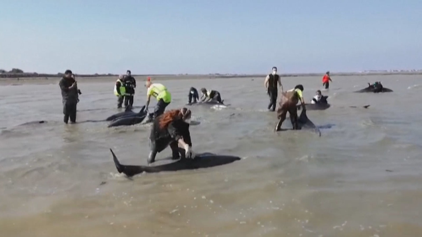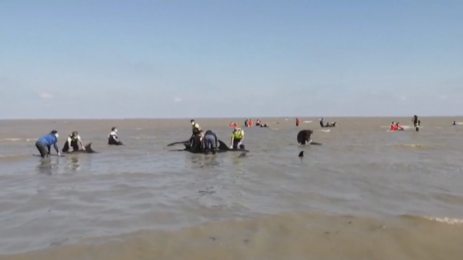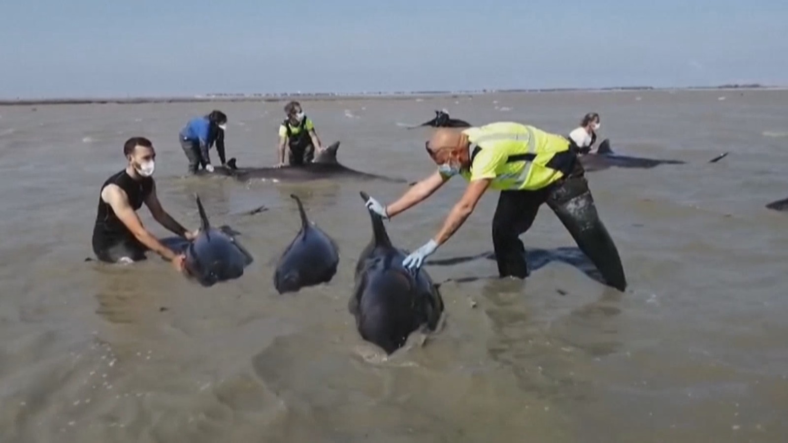 目前这些海豚搁浅的原因尚不清楚,海洋专家推测,它们有可能是在追逐猎物时因退潮被困在了海滩上。