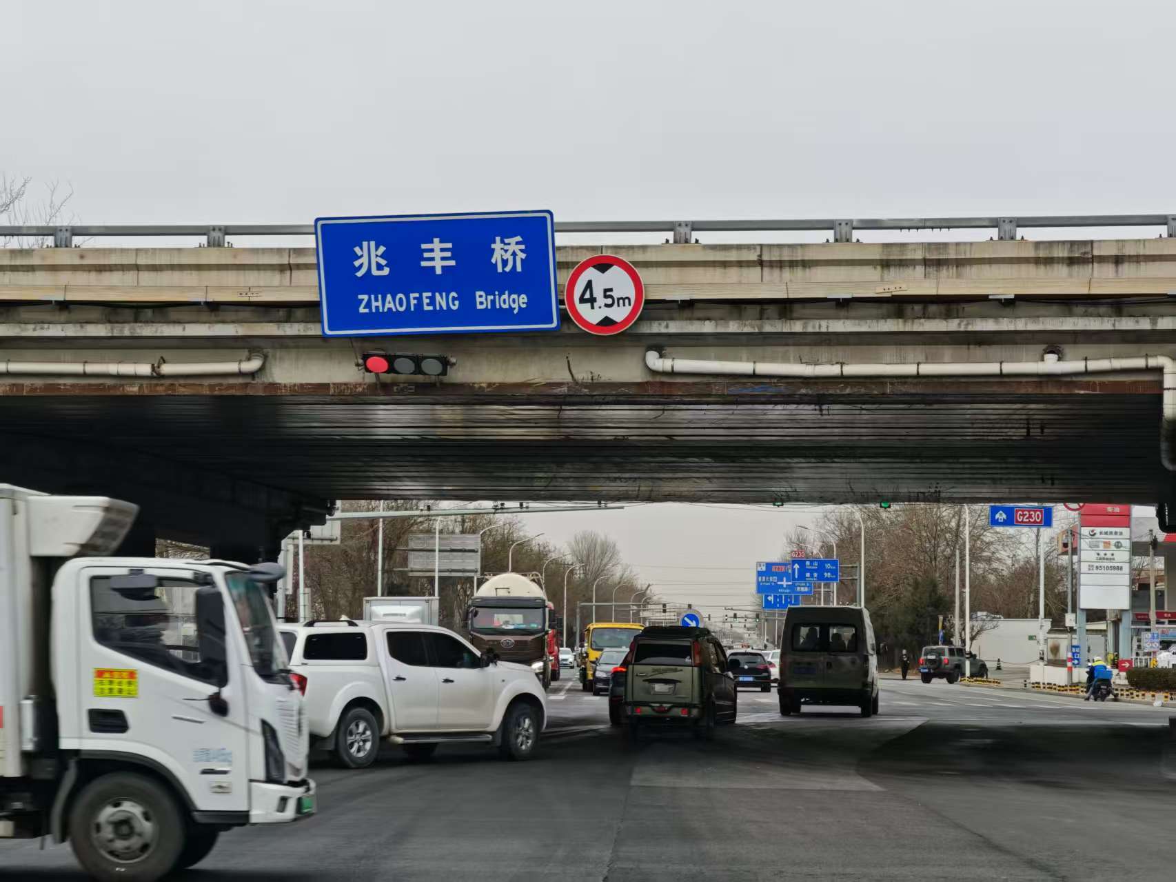 公开报道中,2023年2月份曾有一辆集装箱货车在这里发生了侧翻。记者看到,兆丰桥桥体和周边都有限高4.5米的标识,那桥下高度究竟够不够4米5呢?