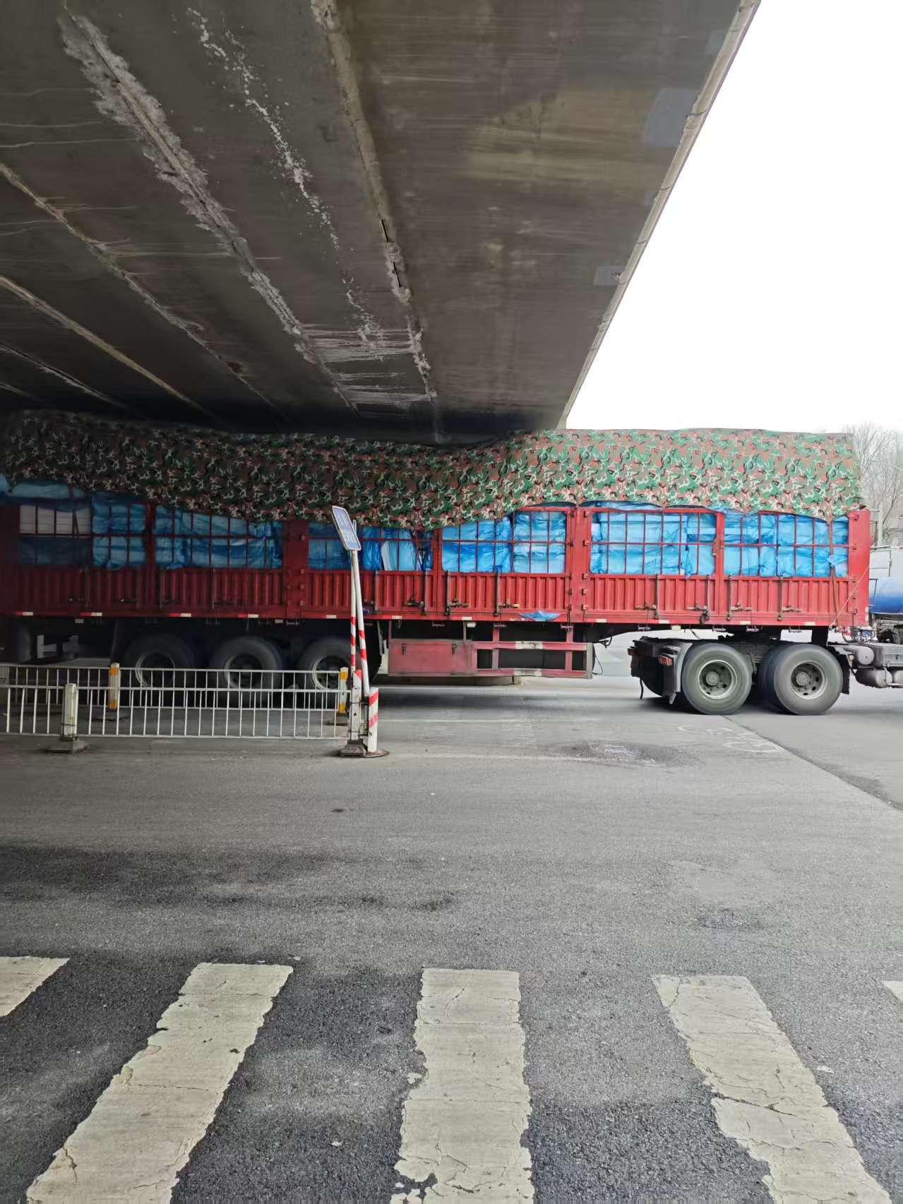 视觉上看到车辆顶部已经快接触到桥梁/记者拍摄