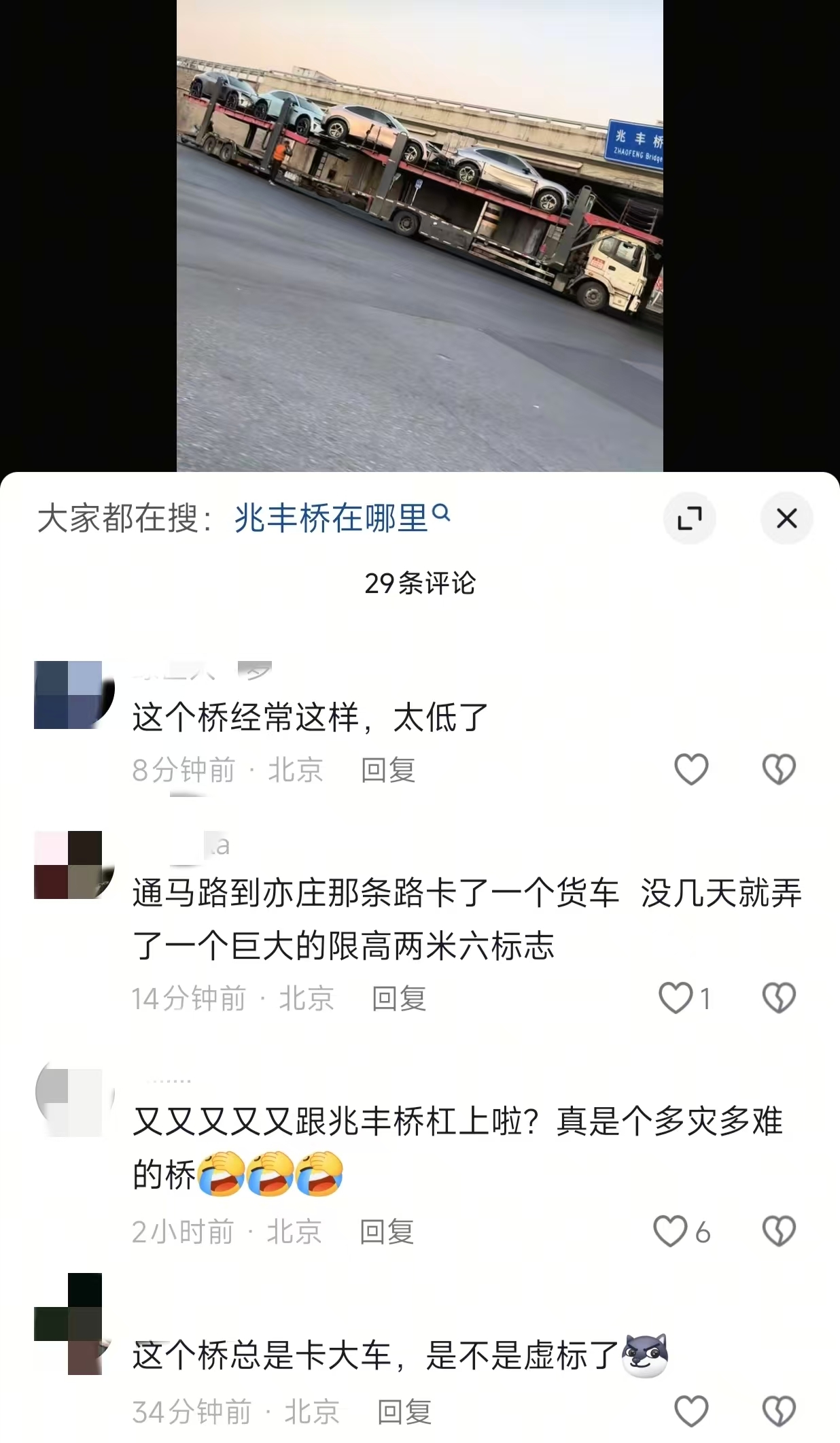 近日,有网友发布了一则运输轿车的车辆被卡在大兴区兆丰桥的视频,下方的留言区有网友留言表示“兆丰桥已经和大货车多次‘互动’了”,也有网友对其标示的限高数据提出了质疑。桥下高度究竟为多少?限高标识是否准确?