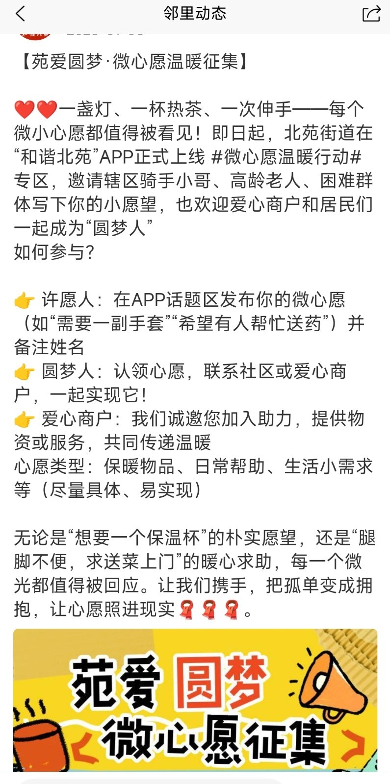 活动前夕,北苑街道依托“和谐北苑”APP,面向辖区新就业群体启动“微心愿”征集活动,聚焦新就业群体在生活、工作中的实际需求。征集通知发出后,辖区骑手们积极响应,纷纷登录APP写下心愿,暖宝宝、充电宝、保温杯、防风眼镜、手机支架等送餐途中常用的实用物品,成为大家的主要心愿。