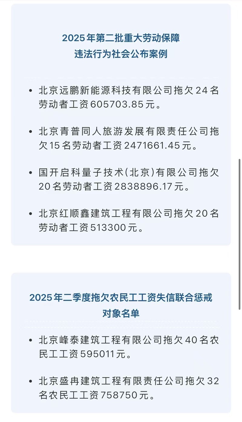 2家工程建设领域企业因拖欠农民工工资,人社部门责令限期支付。因逾期拒不支付,被大兴区、丰台区人社部门列入拖欠农民工工资失信联合惩戒对象名单。失信联合惩戒对象名单依法在区政府门户网站、市人社局官网及信用中国网站公开,受惩戒企业将在政府资金支持、政府采购、招投标、融资贷款、市场准入、税收优惠、评优评先、交通出行等方面受限。(责编 邓力)