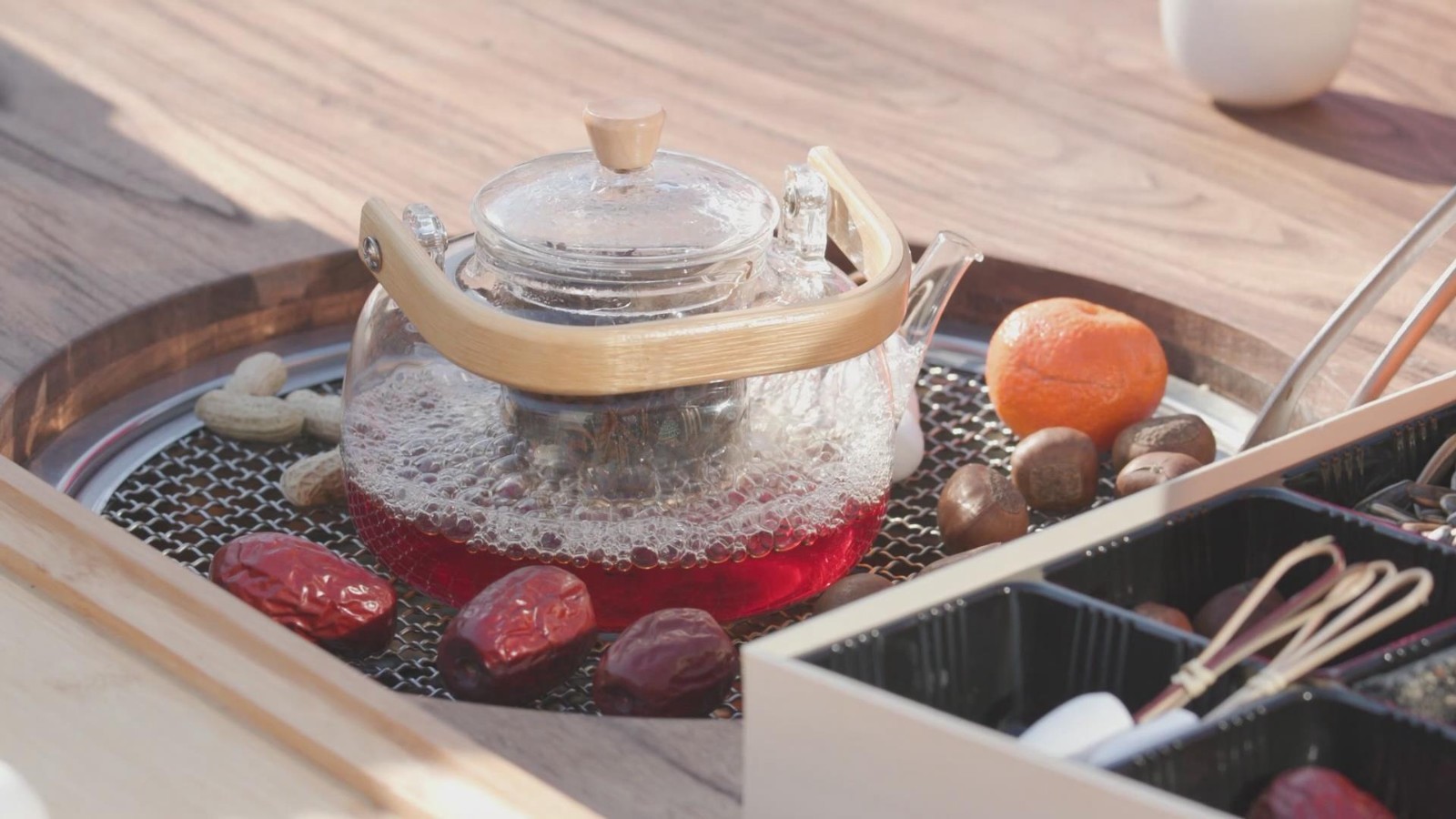 怀柔融媒体中心记者 崔颖:今年咱们的怀北国际滑雪场,还丰富了很多新的旅游场景,比如说这个围炉煮茶,滑雪运动完之后呢晒着太阳,然后喝着热乎乎的茶聊聊天,特别的惬意,来,哇,好暖和。