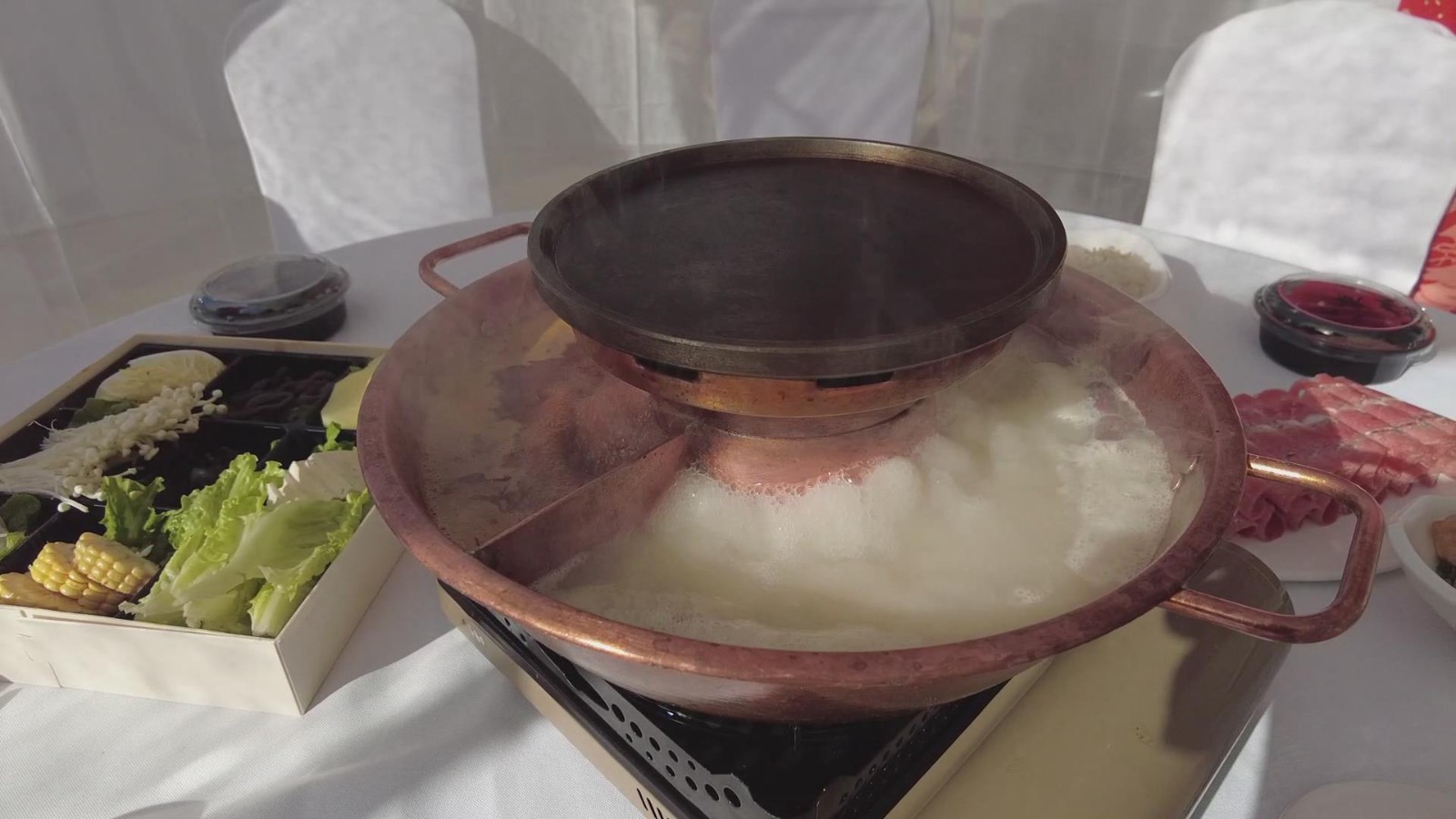 怀柔融媒体中心记者崔颖:春节马上就要到了,雪场也是进行了一个布置,然后灯笼啊、对联特别有年味,而且他们还推出了一个特色美食,特别有情调的雪地火锅,走咱们一块去看看......在这个小帐篷里好有感觉呀,开锅了,哇,好香啊。