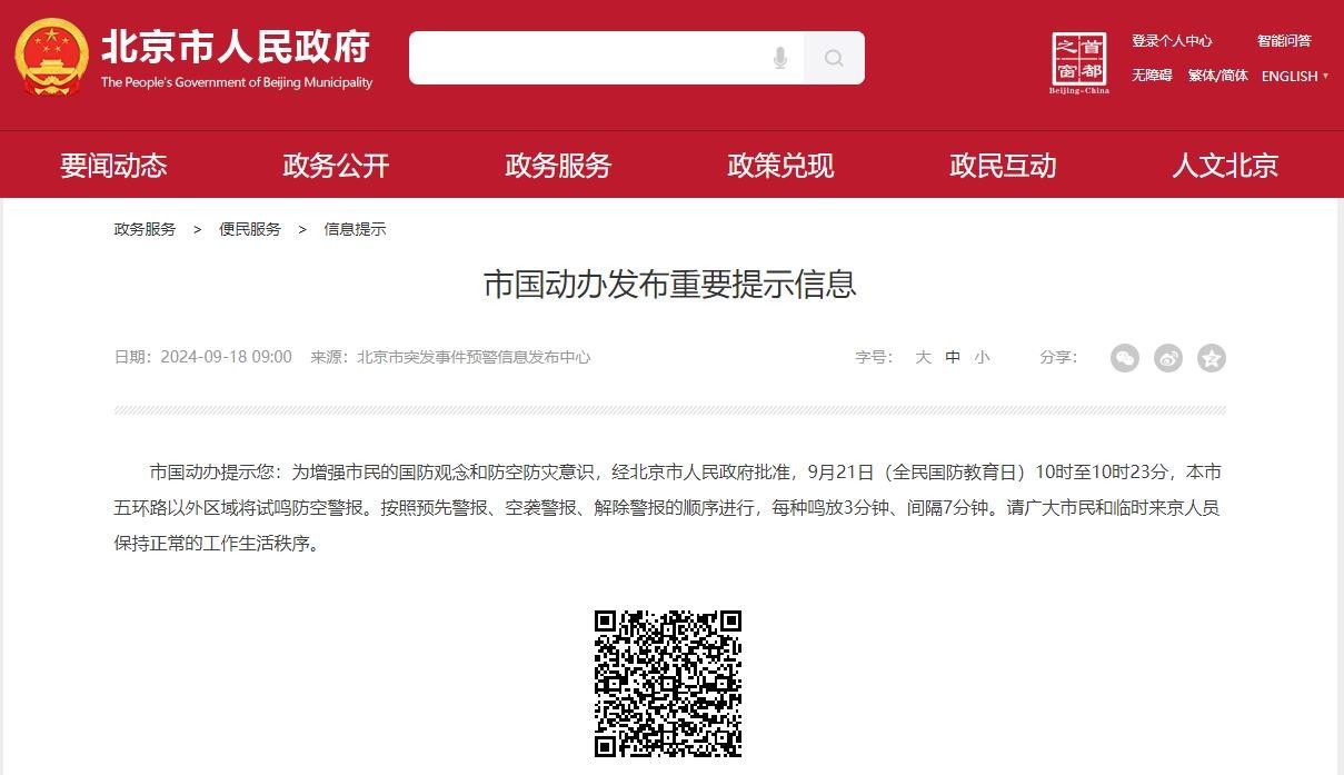为增强市民的国防观念和防空防灾意识,经北京市人民政府批准,9月21日(全民国防教育日)10时至10时23分,本市五环路以外区域将试鸣防空警报。按照预先警报、空袭警报、解除警报的顺序进行,每种鸣放3分钟、间隔7分钟。请广大市民和临时来京人员保持正常的工作生活秩序。