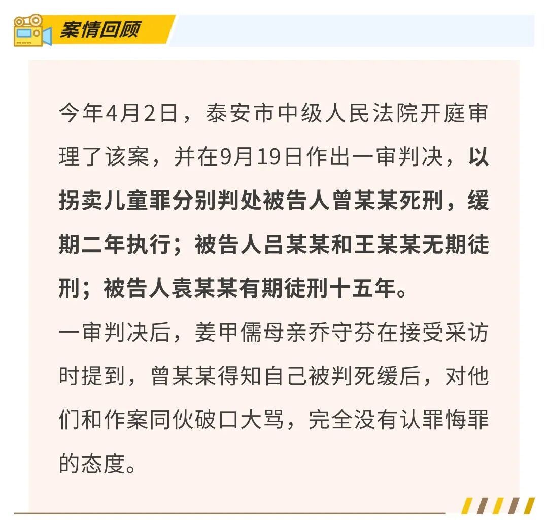 一审时,法院认定4名被告人的行为均构成拐卖儿童罪。其中,主犯曾某某被判处死刑,缓期二年执行;被告人吕某某和王某某无期徒刑;被告人袁某某有期徒刑十五年。