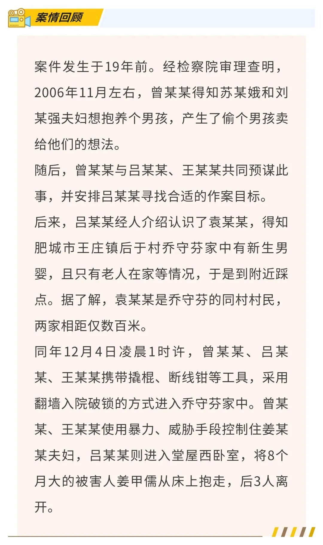 据潮新闻,乔守芬说,正是由于住在姜家不远处的袁某贵,提前将“父母在外打工、家中只有老人、有刚出生的二胎男婴、老人没有手机、孩子住在西厢房”的精准信息透露给人贩子曾某某,才让对方盯上了姜家。“事前他不仅多次带着同伙踩点,事后还若无其事来打探询问孩子找到了没。”