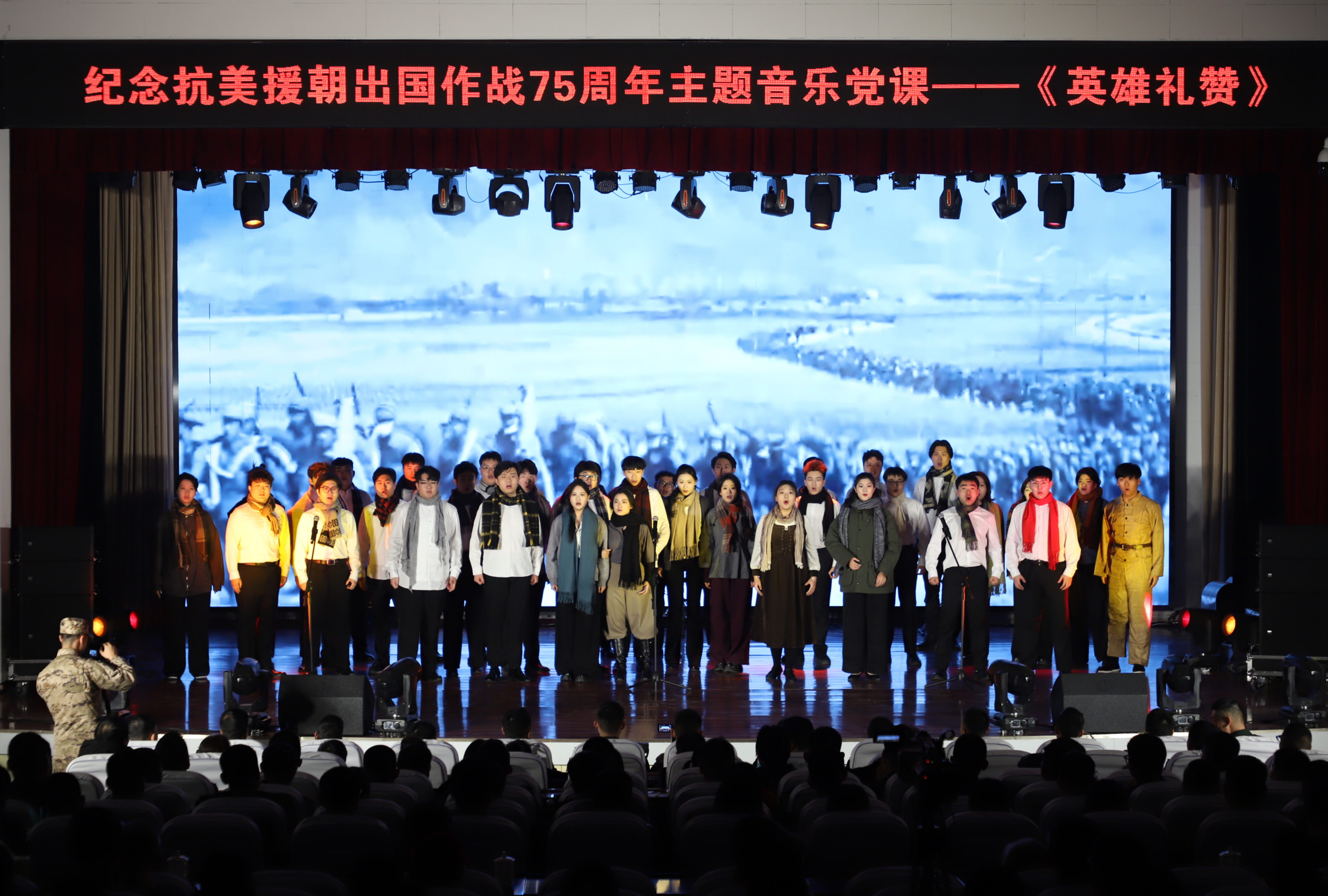 “雄赳赳,气昂昂,跨过鸭绿江……”音乐党课在雄壮激昂的合唱《中国人民志愿军战歌》中拉开帷幕,时而铿锵、时而低沉、时而悲怆、时而高亢,再现了阴云密布的严峻形势和志愿军将士跨过鸭绿江的豪迈气概,瞬间将观众拉回到那个战火纷飞的年代。