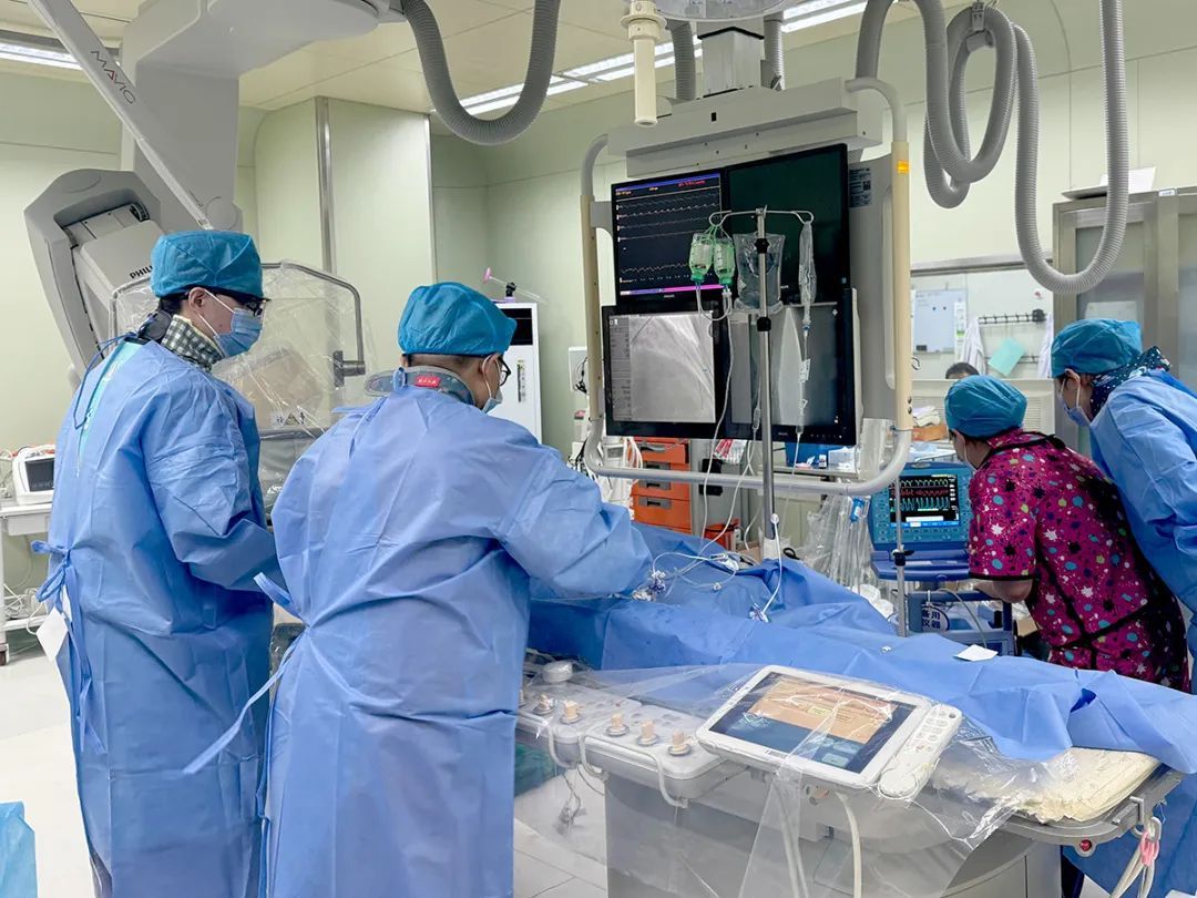 尤洪帅介绍:“造影结果显示冠状动脉前降支自开口处已经完全闭塞,这是导致患者心肌梗死和心跳骤停的重要原因,属于复杂高危手术,情况十分凶险。接诊后能立即展开手术,离不开前期急诊处置迅速得当,患者保持稳定生命体征。”术中,医护人员紧密配合,顺利开通梗死相关血管,手术圆满成功。