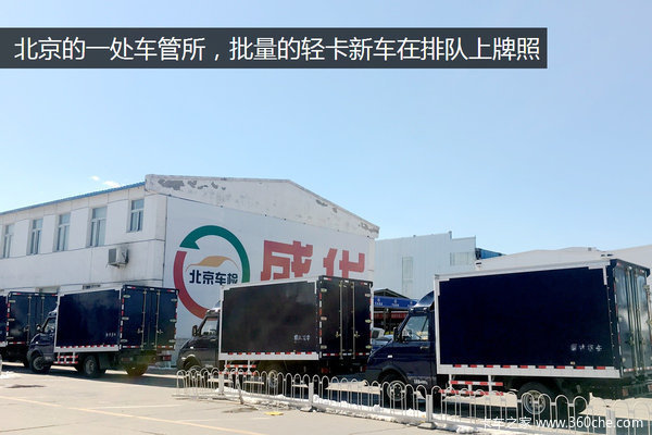 笔者在北京的一处车管所看见德邦蓝涂装的长头轻卡在批量上牌。