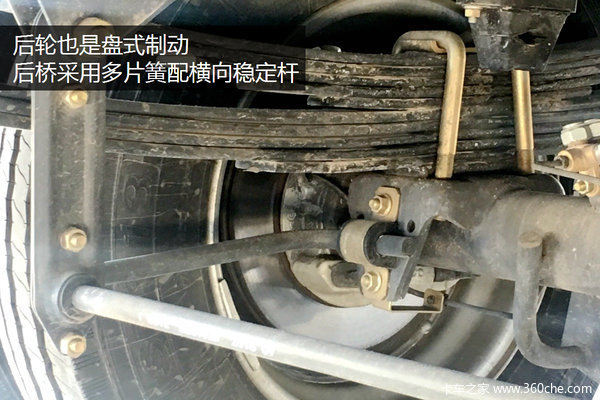 后轮也是盘式制动,后桥采用多片簧悬挂配横向稳定杆,承载能力和稳定性很赞。
