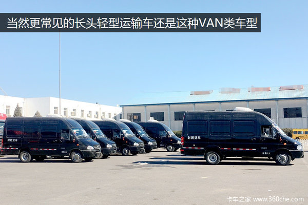 更常见的长头轻型运输车还是这类VAN车型。它们采用客车的车身,有些选择挂货车牌照,有些选择挂客车牌照,在政策适应性方面更灵活一些。但是同样的轴距下,内部的容积不如长头厢货,因为厢货的上装可以做得更高,内部空间也更规整一些。