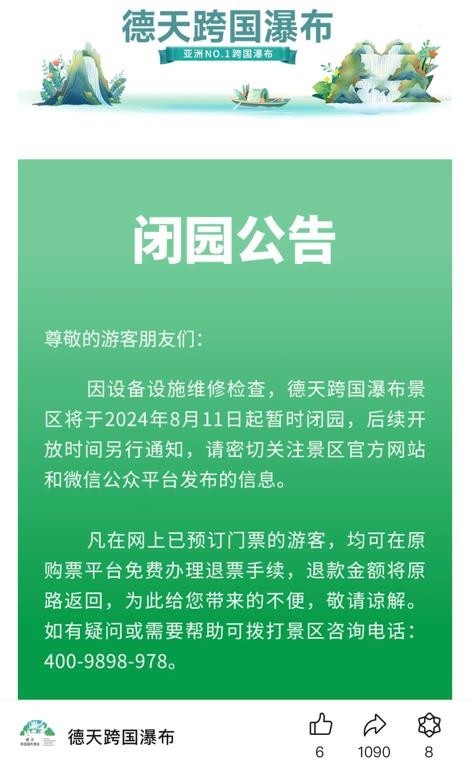 另据德天瀑布微信公众号消息,目前,德天瀑布景区已闭园并安排退票事宜。