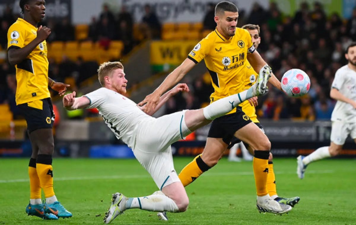 北京时间5月12日凌晨,2021/22赛季英格兰足球超级联赛第33轮迎来一场补赛,“蓝月亮”曼城做客挑战狼队。上半场完全是德布劳内的个人秀,丁丁先是插上射远角为曼城首开纪录,尽管狼队由登东克尔在反击中扳平比分,不过德布劳内立马给予了还击,比利时人先是在门前跟进补射得手,随后禁区外围轰出贴地斩在23分钟上演帽子戏法。下半场斯特林攻入一球因越位在先进球无效,随后德布劳内完成大四喜,斯特林门前推空门得手,福登和丁丁相继射门击中立柱弹出。全场比赛结束,曼城客场5-1大胜狼队,继续以3分的优势领跑。