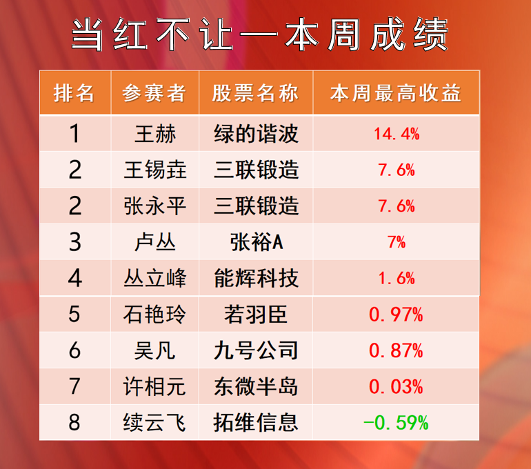 强市抓牛股,弱势赢大盘。关注《天下财经》模拟盘竞技版块《当红不让》。指数的大起大落考验着每一位选手,本周选手收益也因此拉开差距。