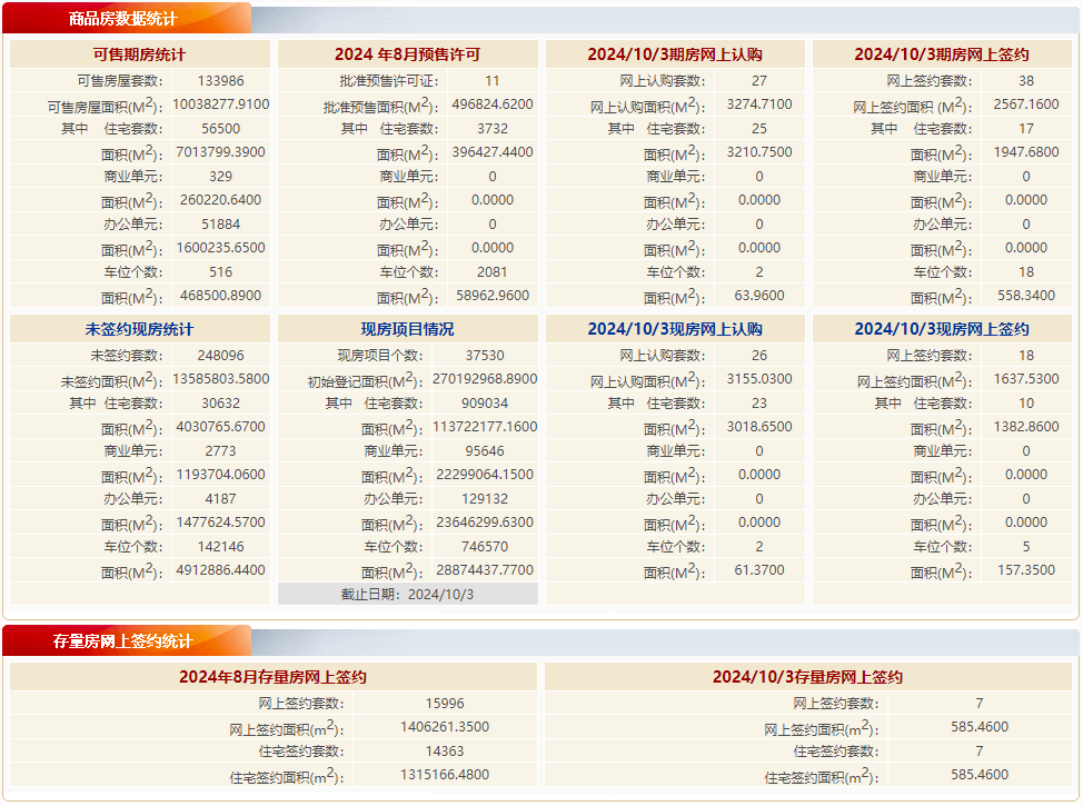根据北京市住房和城乡建设委员会数据:10月3日,北京新房住宅网签27套,网签面积3,330.54㎡;二手房住宅网签7套,网签面积约585.46㎡。