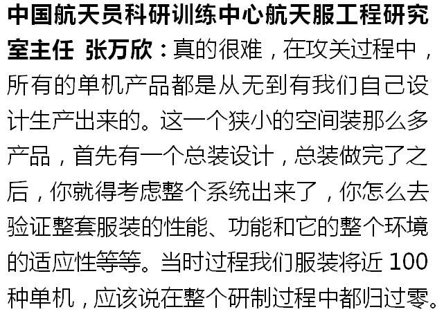 中国航天员科研训练中心航天服工程研究室主任 张万欣:他们试穿完了当时提出了三十几条意见建议,然后我们都逐条落实。其实最难改的就小型化。
