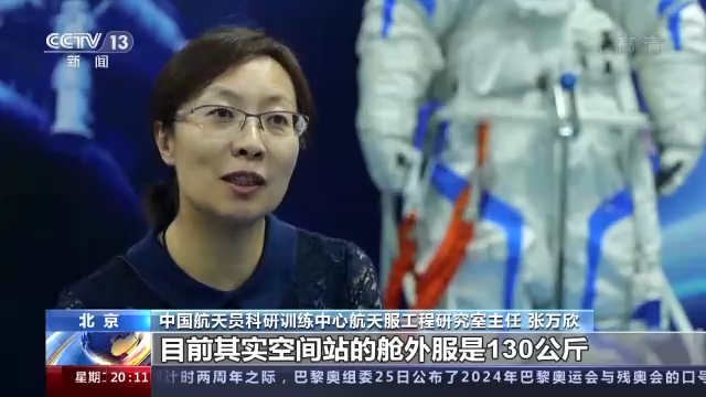 中国航天员科研训练中心航天服工程研究室主任 张万欣:空间站的舱外服是130公斤,因为它比神(舟)七(号)的时候功能增加了许多,比如摄像功能,然后好多单机都进行了备份,提高可靠性,冗余备份都有了,所以它比神(舟)七(号)增加了10公斤。