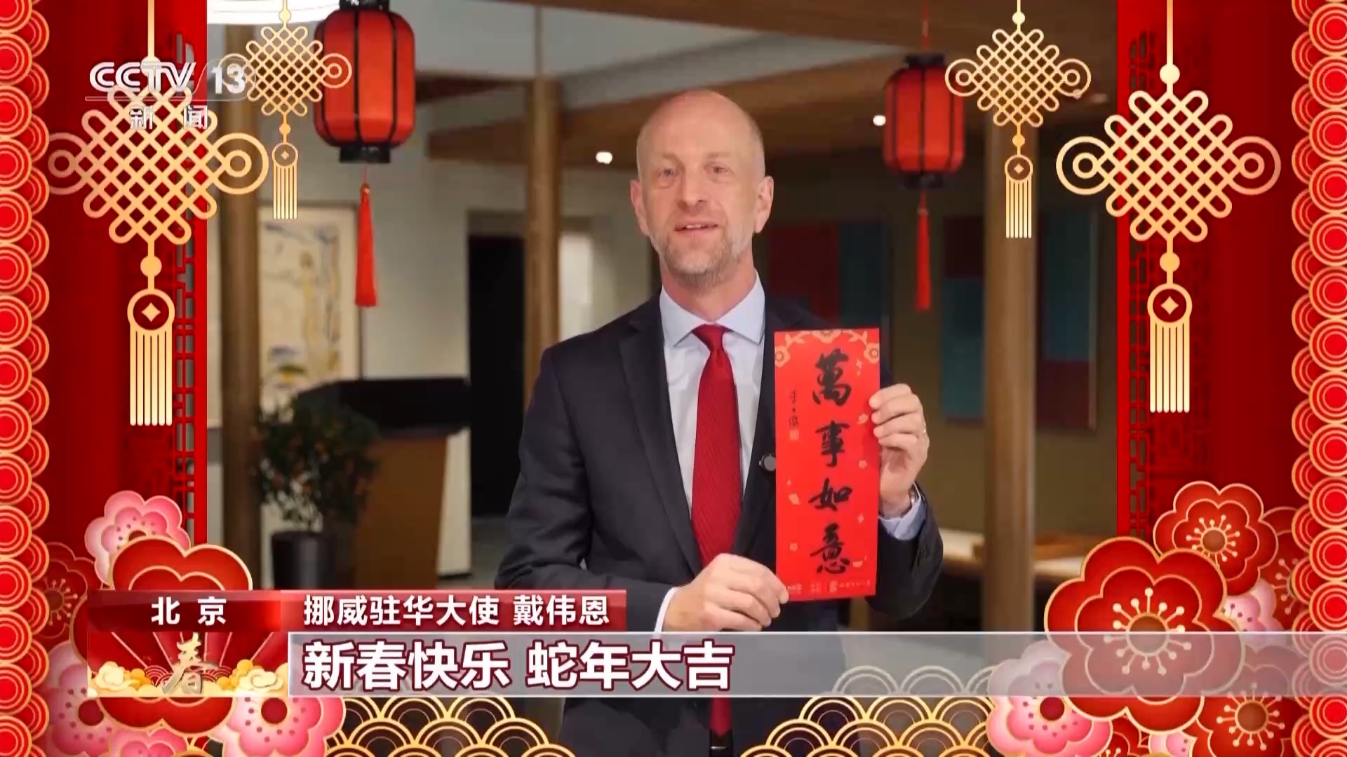 挪威驻华大使 戴伟恩:中国在奥斯陆的大使馆每年春节都会举办盛大的联欢会,去年我也有幸参加。那时我就了解到,春节是一个让人们团聚、给人以欢乐的节日。我的中国同事告诉我,蛇年是转型之年、幸运之年,这一年的好运将惠及每一个人。