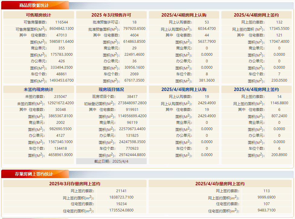 根据北京市住房和城乡建设委员会数据:4月4日,北京新房住宅网签127套,网签面积约17,854.64㎡;二手房住宅网签107套,网签面积约9483.71㎡。