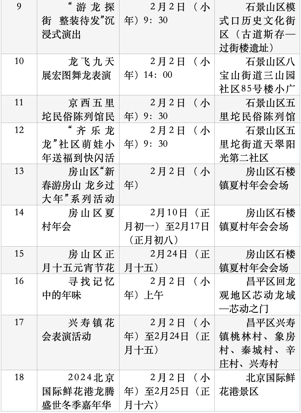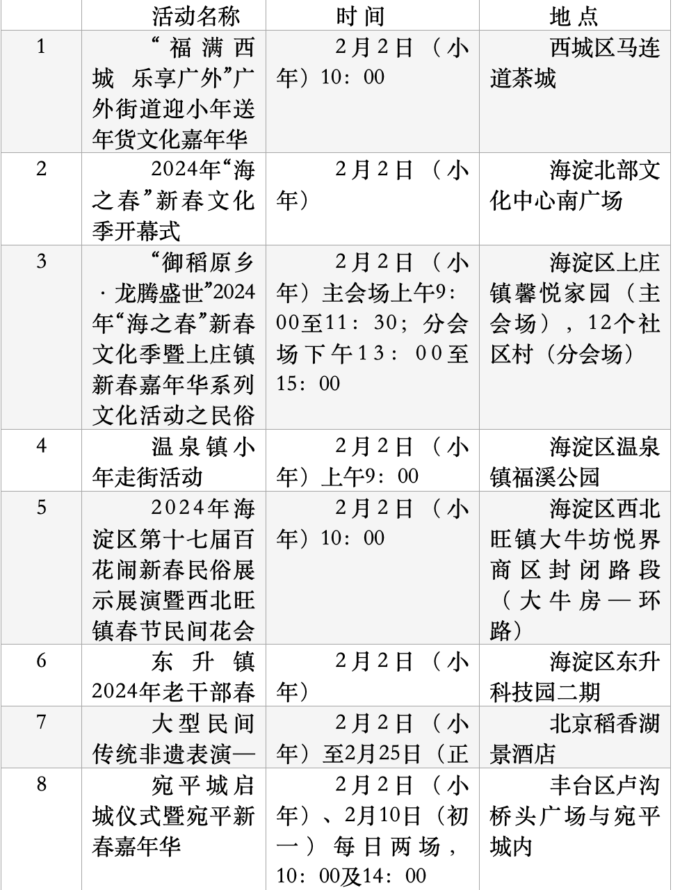 海淀区将于农历小年当天在海淀北部文化中心南广场、西北旺镇大牛坊悦界商区封闭路段、上庄镇馨悦家园北街、温泉镇10余个街村举办“海之春”新春文化季开幕式和山后四镇民间花会秧歌联合踩街活动,22条舞龙60支花会队伍2100余名群众参与表演;大型艺术装置作品《长城龙》将亮相圆明园遗址公园,公园正月初一至初八,每天在洞天深处小广场的圆明园新春大舞台进行舞龙表演,上下午各一场;北京稻香湖景酒店将于农历小年至正月十六推出非遗表演打铁花。