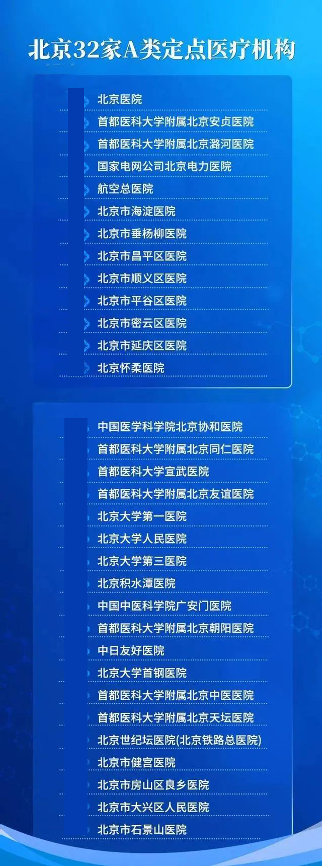 3月31日,北京市医保局下发《关于公布北京市基本医疗保险A类定点医疗机构增补名单的通知》,新增13家医疗机构成为A类定点医疗机构,目前,北京市共有32家A类定点医疗机构。