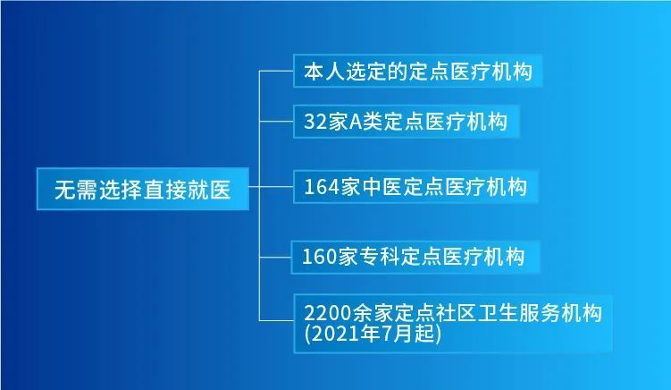 目前,北京市共有2900余家基本医疗保险定点医疗机构,按照本市基本医疗保险参保人员就医管理规定,除本人选定的定点医疗机构以外,还有32家A类定点医疗机构、165家中医定点医疗机构、160家专科定点医疗机构无需选择,可直接就医。另外,自7月1日起,北京2200余家定点社区卫生服务机构全部可直接医保结算!