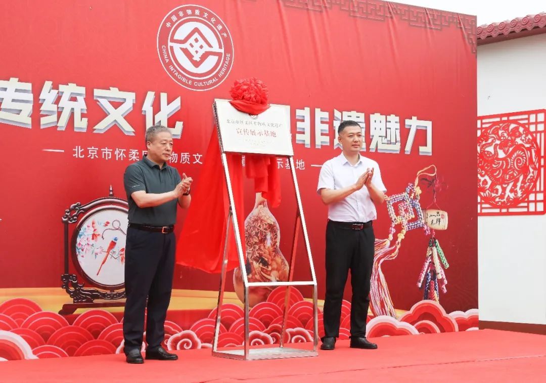 伴随着热烈的掌声,副区长于家明、政协副主席高永革共同为怀柔区非物质文化遗产宣传展示基地揭牌。