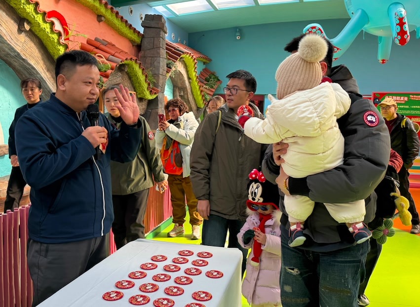 作为马年新春的特色活动,“马年纳福集戳打卡”“马年说马科普小课堂”同步开展,游客们一边游园观赏,一边参与闯关互动、学习动物知识,在娱乐中感受生肖文化的魅力。水豚广场、鹿园广场、小火车广场三大广场的年味游园会更是人气爆棚,“拼图识马”“听音识马”等趣味游戏吸引孩子们踊跃参与,红包墙抽奖、动物图案限定胸章领取等活动,让每一位游客都能收获新春惊喜。此外,恰逢黑猩猩珂伊生日,珂伊餐厅内举办了温馨的庆生活动,邀请游客共同参与,用餐游客可获得专属甜品。