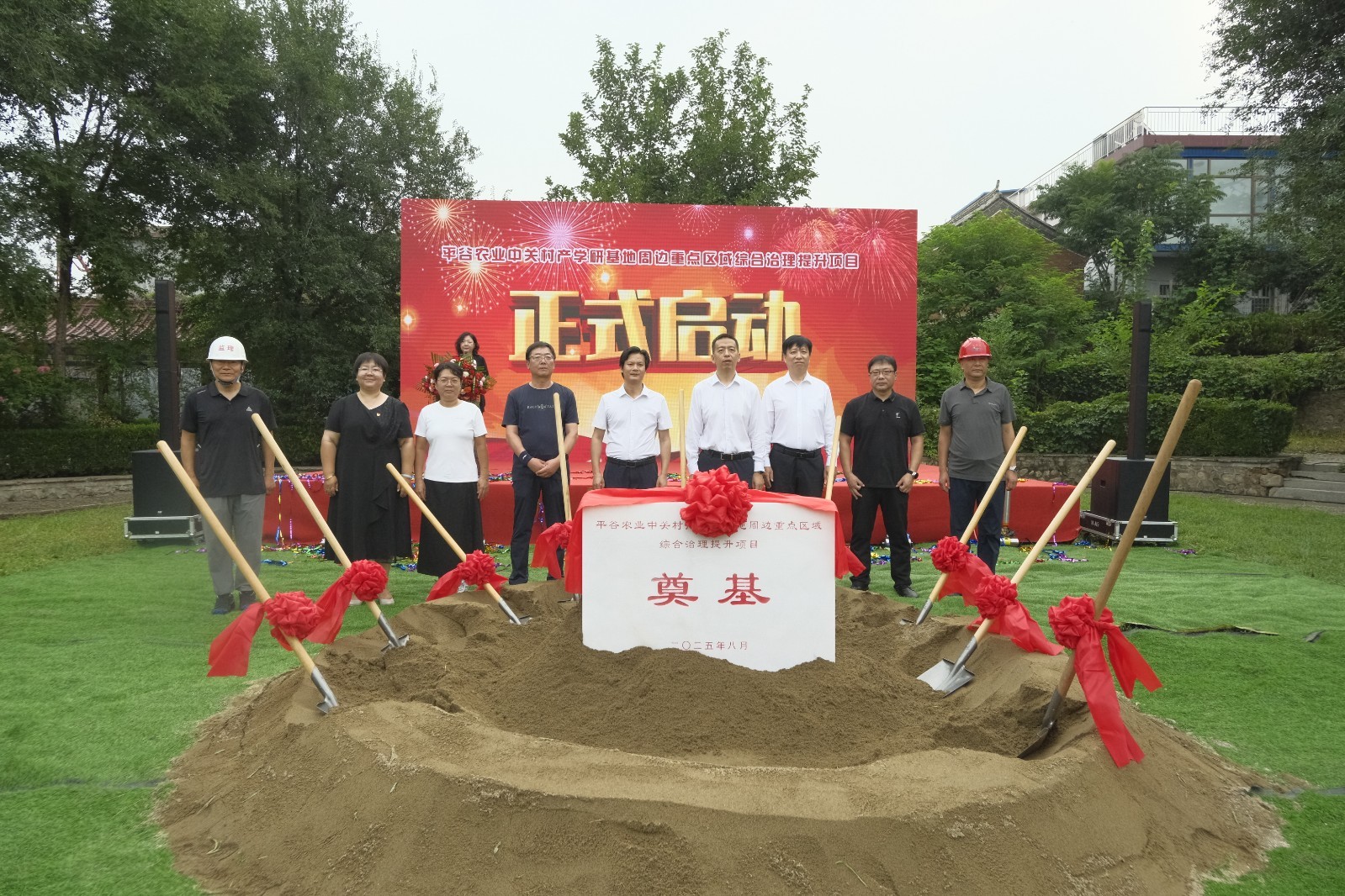 本端讯(通讯员胡梦昊)8月15日,承载着五百年“仁义”文化的北京市平谷区平谷镇和平街村锣鼓喧天,备受瞩目的“平谷农业中关村产学研基地周边重点区域综合治理提升项目”正式奠基开工。平谷区发改委、规自分局、责任规划师等十余个部门负责人,与和平街村民代表、项目参建单位共同挥锹培土,标志着这一北京市发改委重点支持的民心工程进入实质性建设阶段。