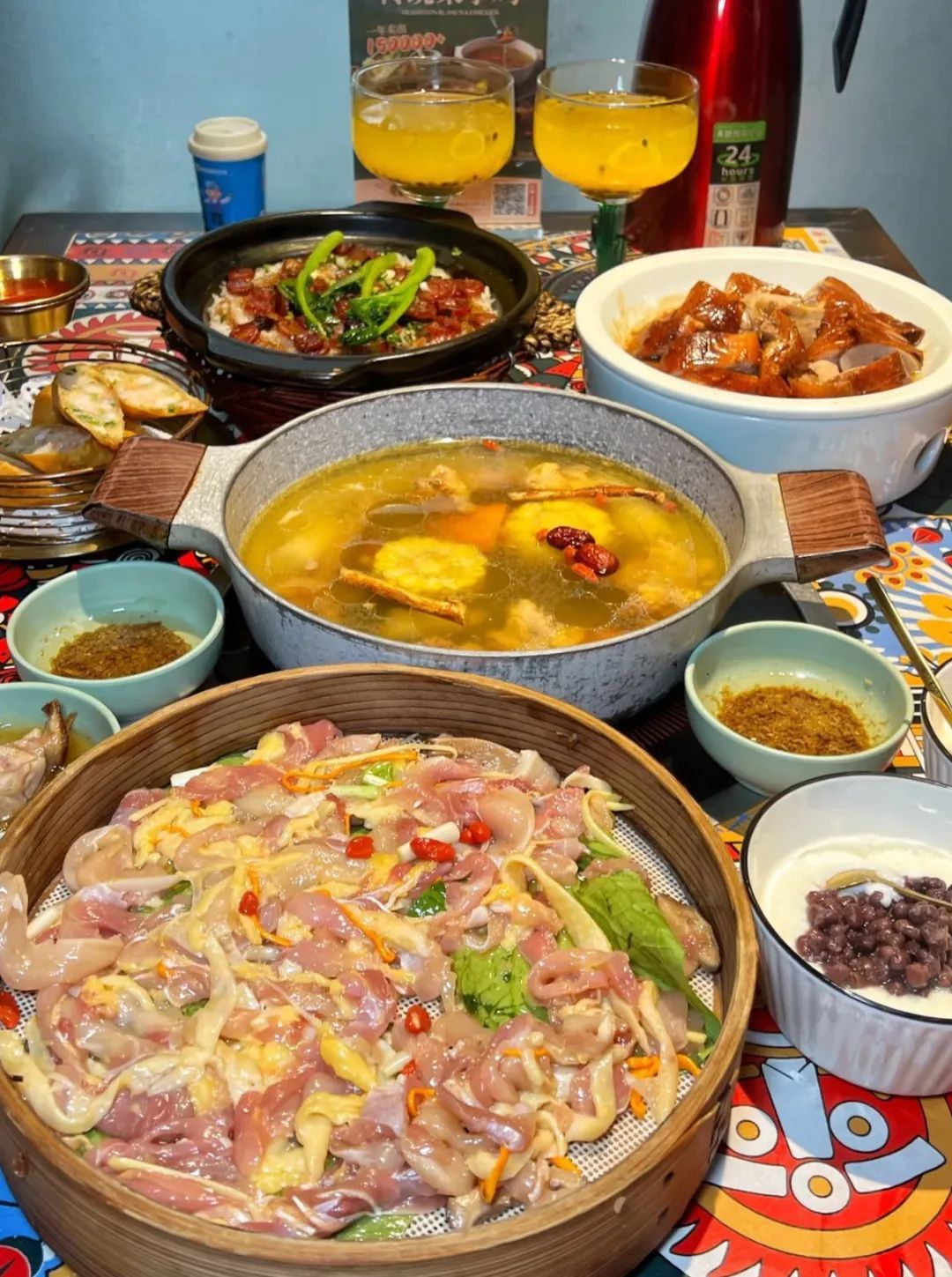 传统桑拿鸡、手工鲜虾春卷、广式烧鸭、深井烧鹅、顺德无骨鲫鱼、腊味煲仔饭、红豆双皮奶、干炒牛河、脆皮红烧乳鸽、啫啫生肠