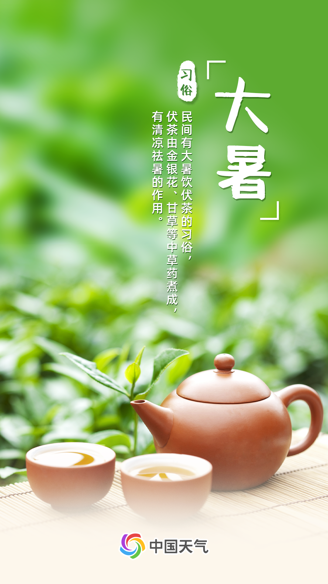 自古以来,民间有大暑饮伏茶的习俗,伏茶顾名思义,是伏天里饮的茶,多由金银花、甘草等中草药煮成,有清凉祛暑的作用。此外,大暑还有烧伏香、晒伏姜等习俗。大暑是一年中天气最热、湿气最重的时节,此时节养生保健的重点是“防暑”和“祛湿”。