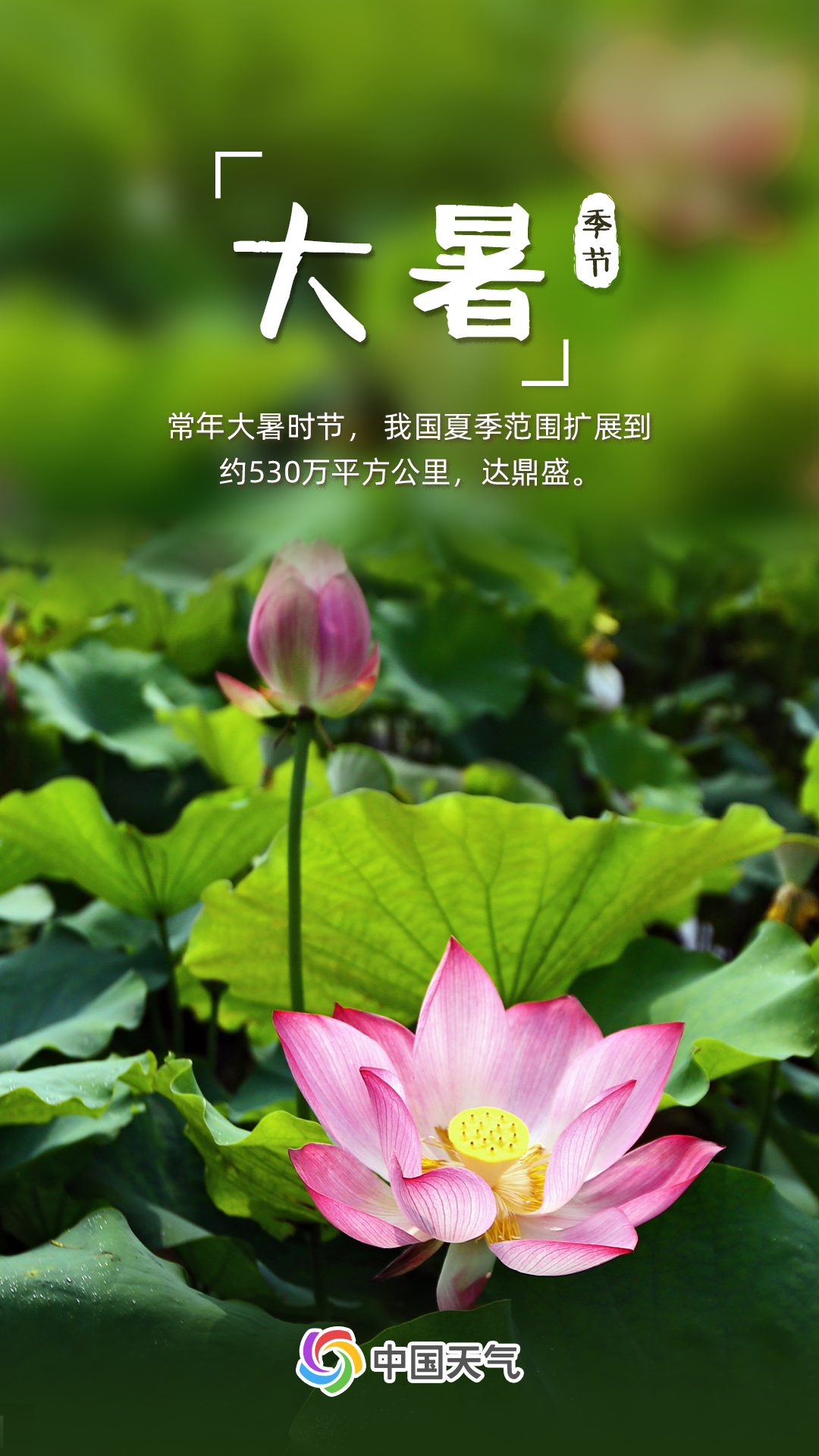 常年大暑时节,我国夏季范围扩展到约530万平方公里,达到一年中的鼎盛。也是在大暑期间,夏季开始盛极而衰的过程,之后进入立秋节气,秋季开始扩充地盘。