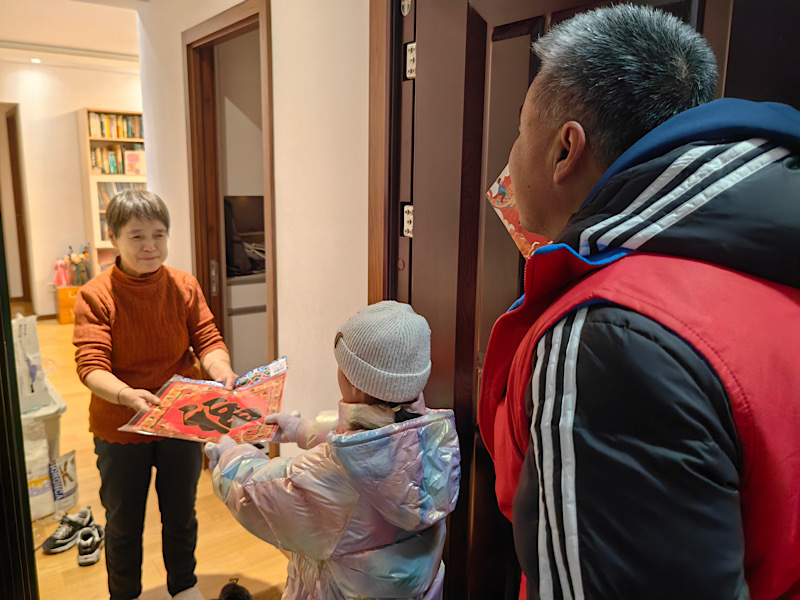 “老板您好,快过年啦,给您送福字来啦!您看店外这些堆物,既影响美观又不安全,咱们清理一下,顾客看着也舒心呀~”邻里爸妈团带着孩子走进沿街商户,温和的语气、贴心的建议让商户们纷纷点头。