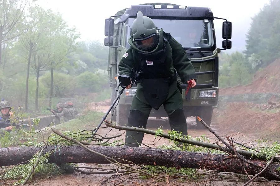“前方发现雷场!”指挥员迅速命令一组进行掩护,二组前出排雷,稳妥快捷地开辟一条安全通路。
