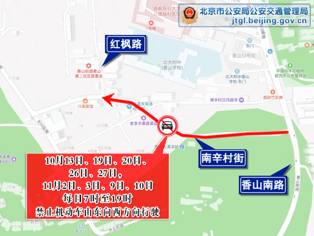 一年一度的香山红叶节现已拉开序幕,10月19日(周六)和20日(周日)为今年前两个重点日,游客较多。为确保红叶观赏季期间香山地区交通安全顺畅,10月13日、19日、20日、26日、27日,11月2日、3日、9日、10日,每天7时至19时,南辛村街(红枫路至香山南路段)禁止机动车由东向西方向行驶。