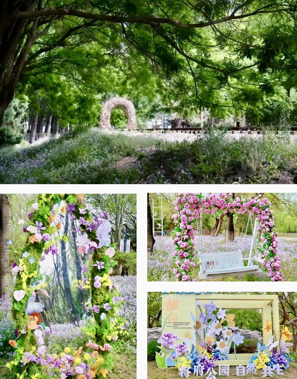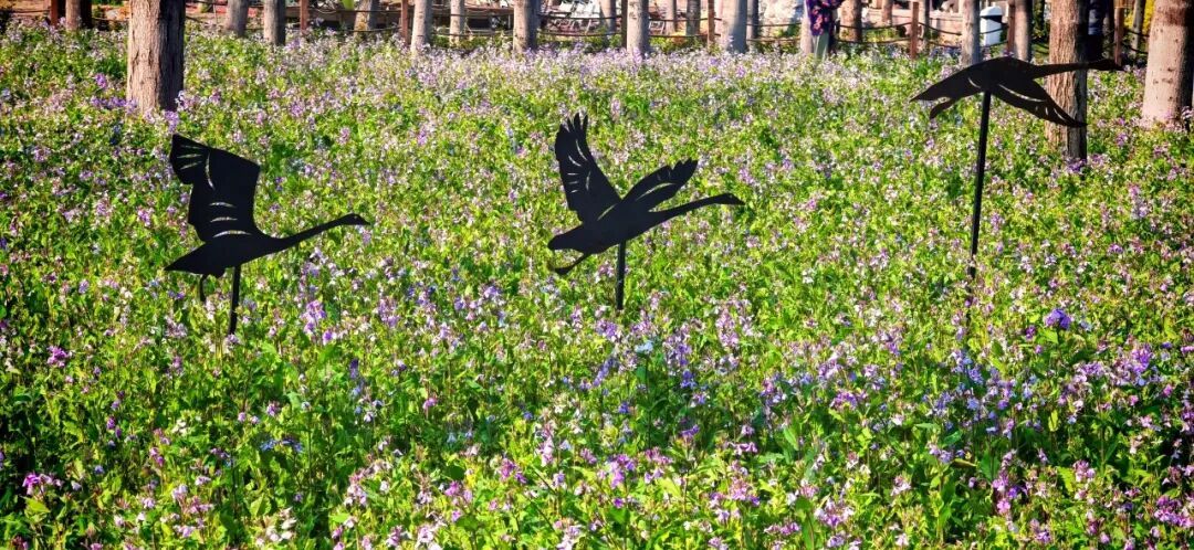 园中有一段废弃的铁轨,正好从花海中穿过,铁锈与花色交织,多了几分时间沉淀下的岁月痕迹。微风拂过,花影轻晃,仿佛整片春天都在脚边缓缓流动。园方还设置了几处艺术装置,方便大家打卡出片。