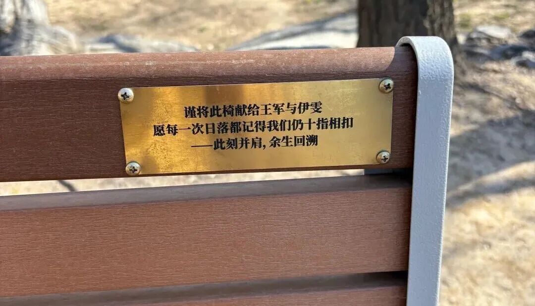 傍晚时分是约会这把长椅的最好时候,它的铭牌上写着:“愿每一次日落都记得我们仍十指相扣,此刻并肩,余生回溯。”