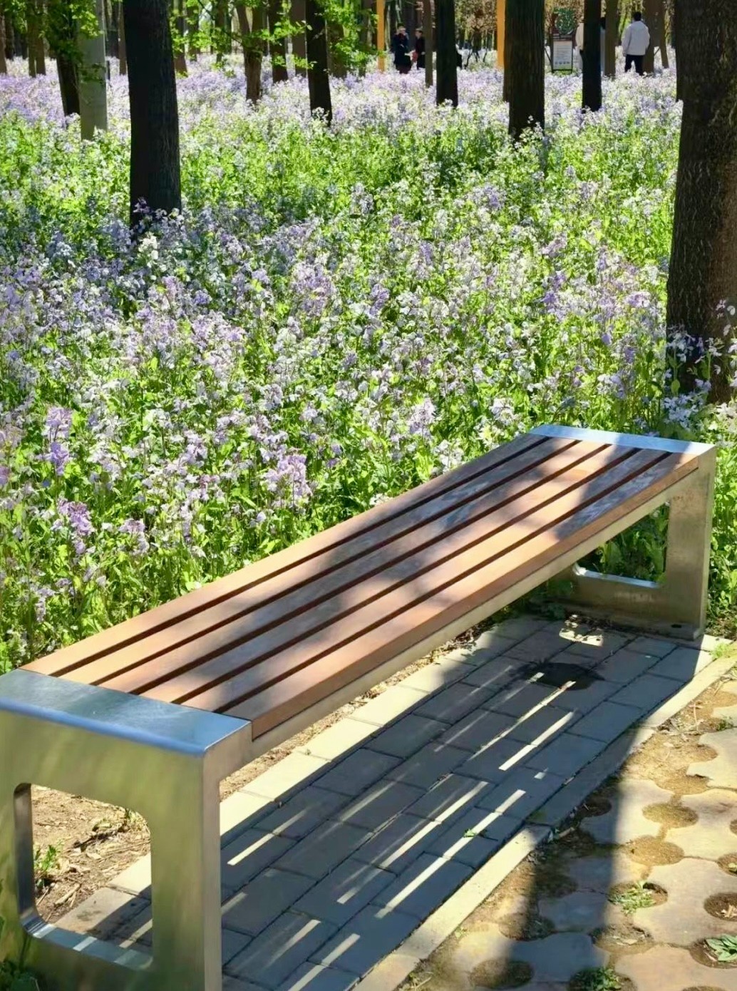 在一望无际的花海中,蜿蜒的步道太适合悠闲散步了,让人走着走着就不由停下脚步,融入花间,融入春天。当然,步道的另一个好处是能让人深入花间,拍出照片来也更有层次感。而间或出现的长凳,既是休息的好地方,也常常入画变身主角。