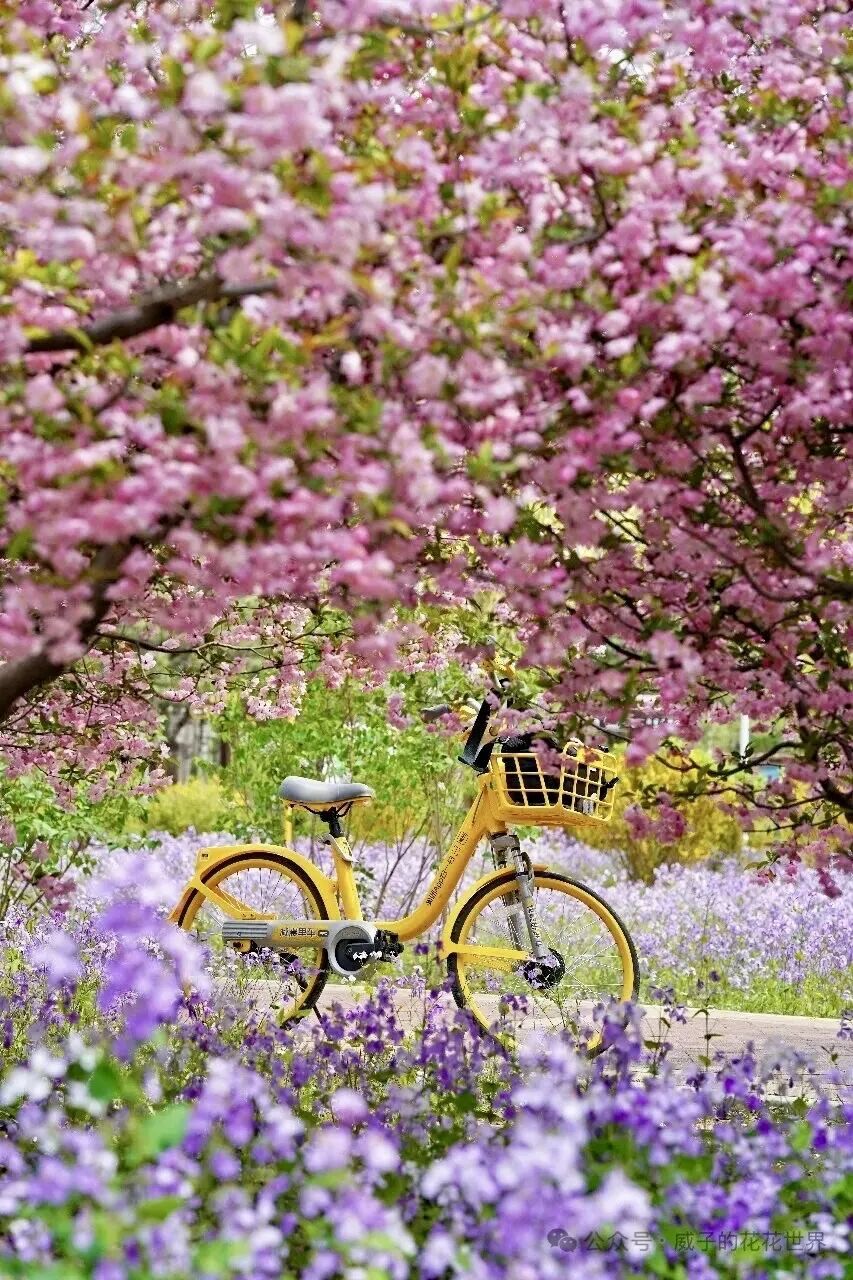可以骑车进入,是东风公园的一大优势。扫一辆小黄车,不仅转场、运装备更方便,还是色彩绝佳的拍摄道具,亮黄色搭配二月兰深深浅浅的紫色系,太出片了!