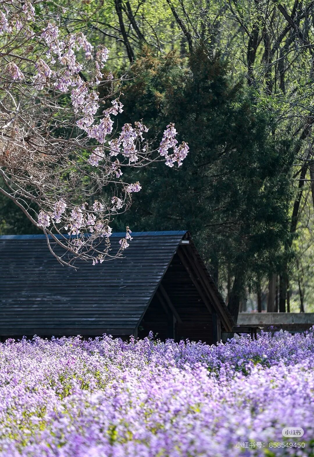 拍照时别忘了让紫色花海与近处泡桐树枝头的淡粉、远处树梢的嫩绿同框,画面层次、色彩搭配瞬间变得更高级。
