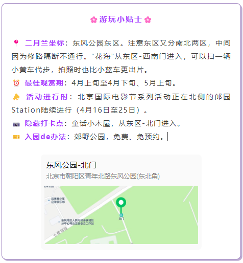 特别提醒一下,东风公园分为东、西两区,二月兰主要在东区。东区又分南北两部分,因为修路被隔开了,小木屋在北侧,从公园的“东区-北门”进入。