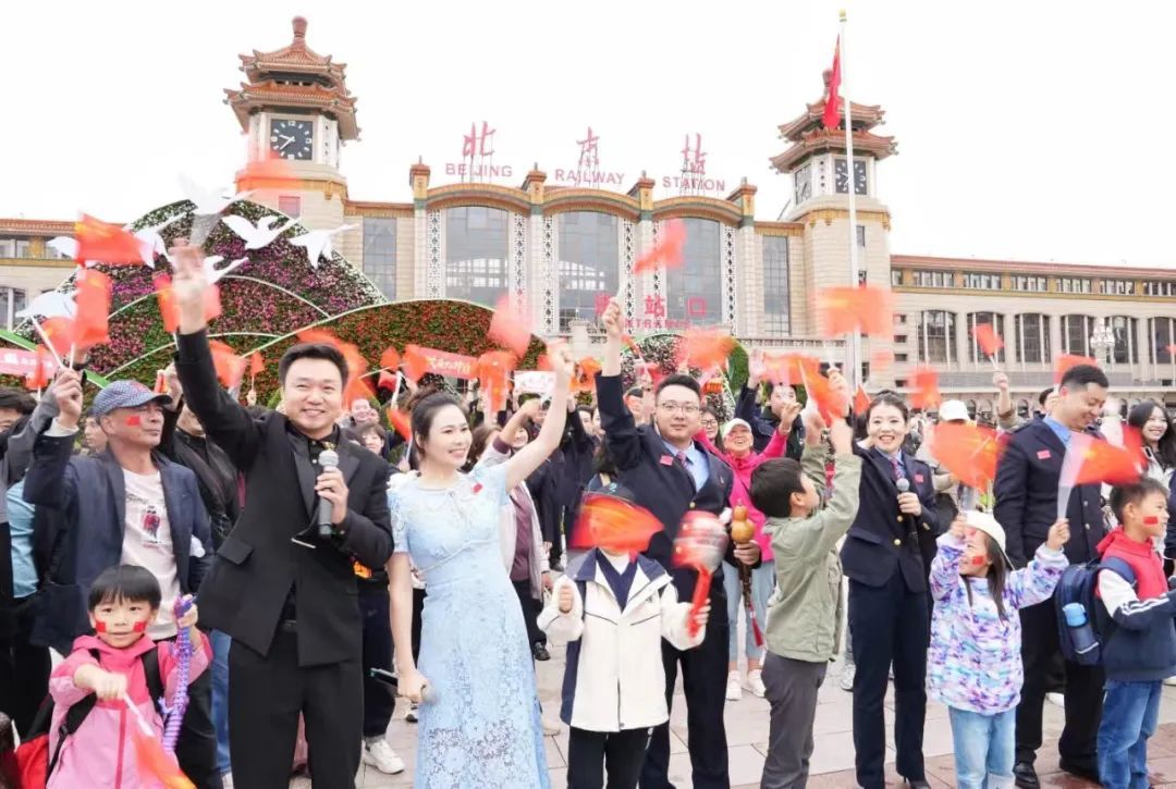 北京站联合中国铁路文工团、北京站重点站区办、车站派出所等在站前广场举办“盛世华章·共庆华诞”快闪活动。