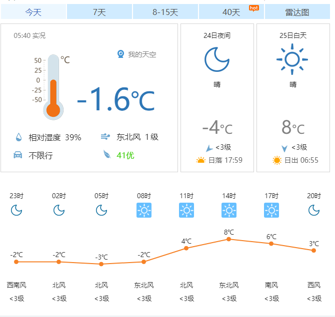 今天早晨:晴间多云;偏北风 2、3 间 4 级;-2~2℃。