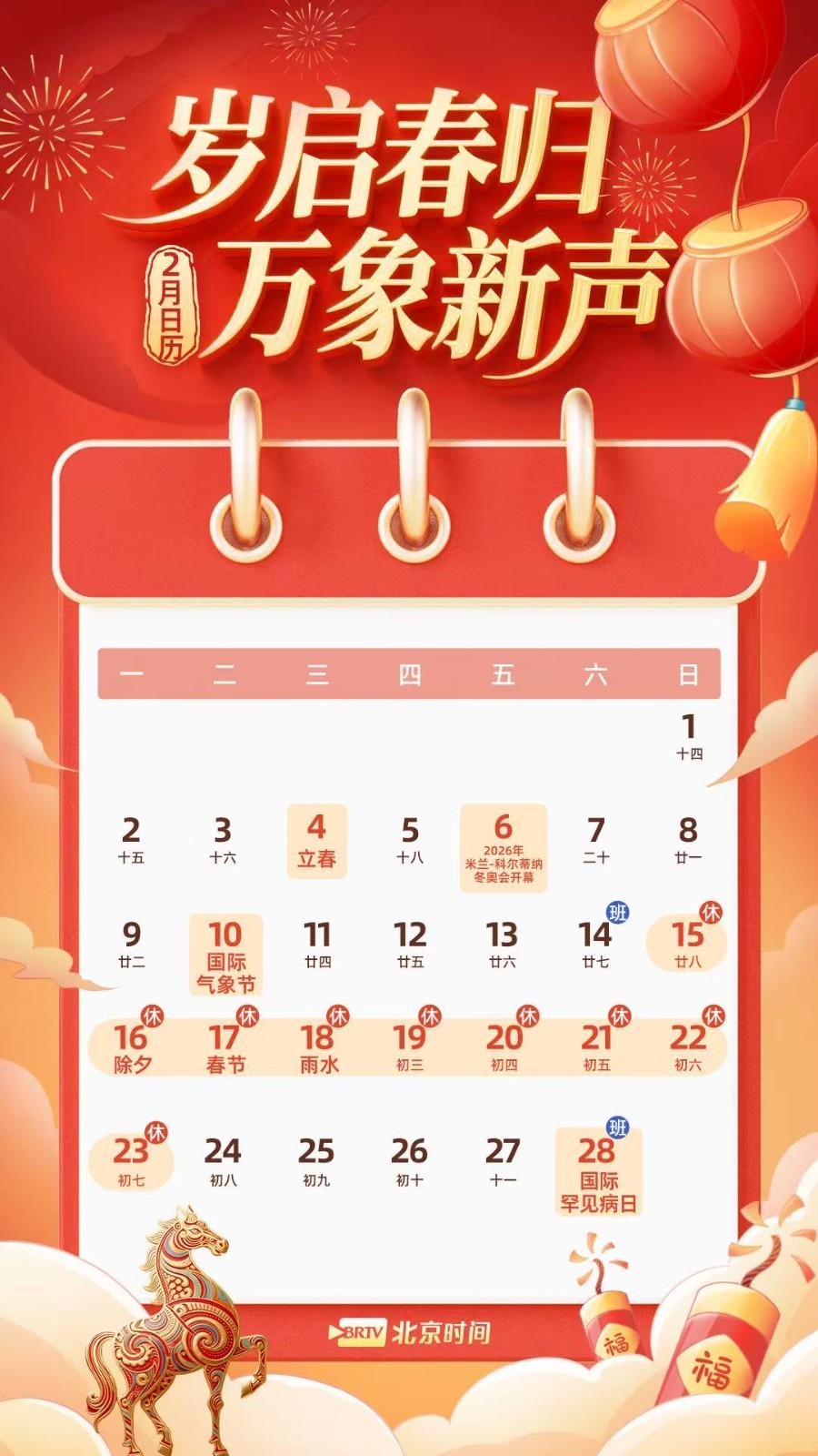 甲辰辞旧岁,丙午马年谱新章!2月,我们将迎来立春节气,春风送暖,草木初萌,随后雨水节气也将如期而至。2月我们也将见证2026年米兰-科尔蒂纳冬奥会盛大开幕,感受冰雪运动的无穷魅力。2月还将迎来春节,见证一年之中最浓厚的团圆烟火气!让我们一起在温暖又昂扬的2月,共赴新光景,同绘新画卷!